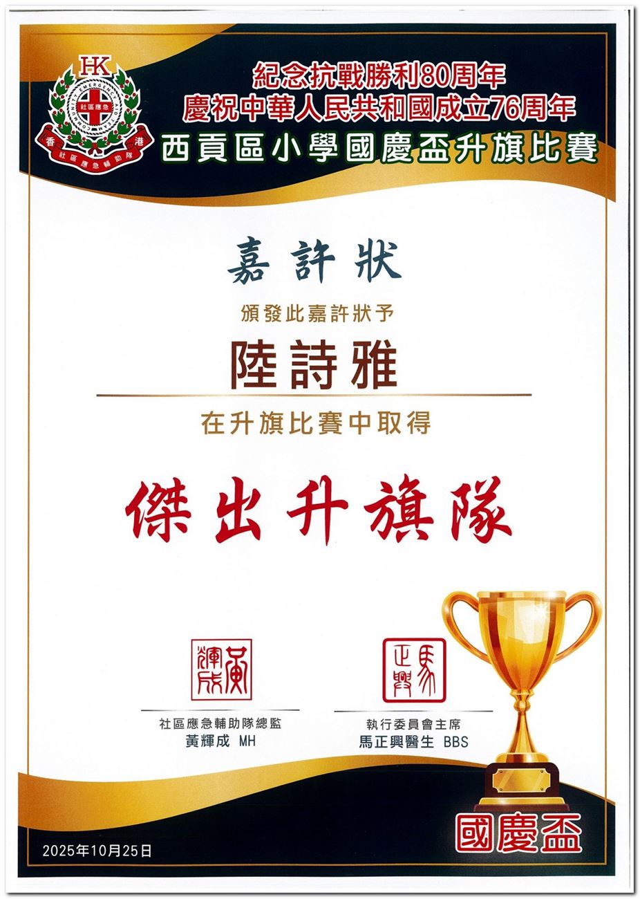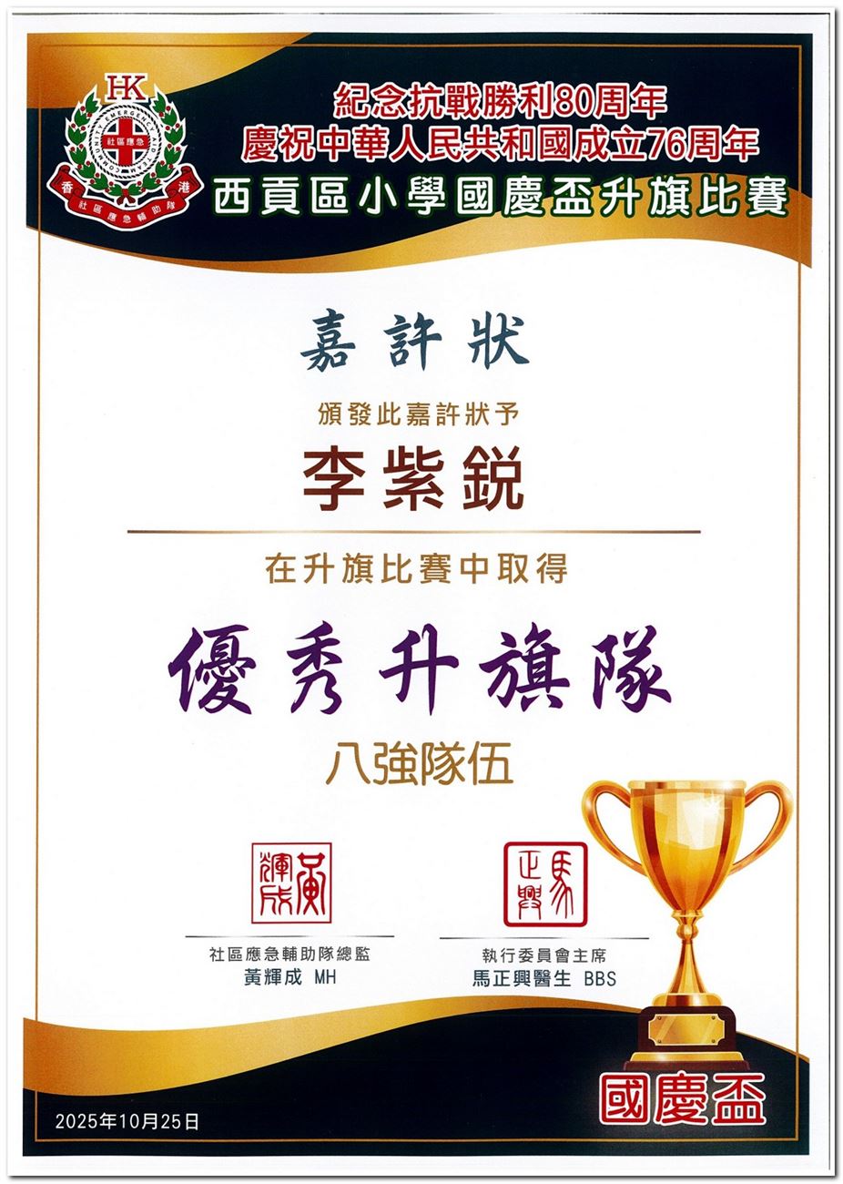 由社區應急輔助隊主辦的「西貢區小學國慶盃升旗比賽2025總決賽」,本校共派出12位隊員參加,其中6E莊禮賢獲得紅旗先鋒獎擎旗手的優異,而4隊旗隊亦分別獲得優秀升旗隊八強隊伍以及傑出升旗隊的榮譽,在此恭喜各得獎學生。