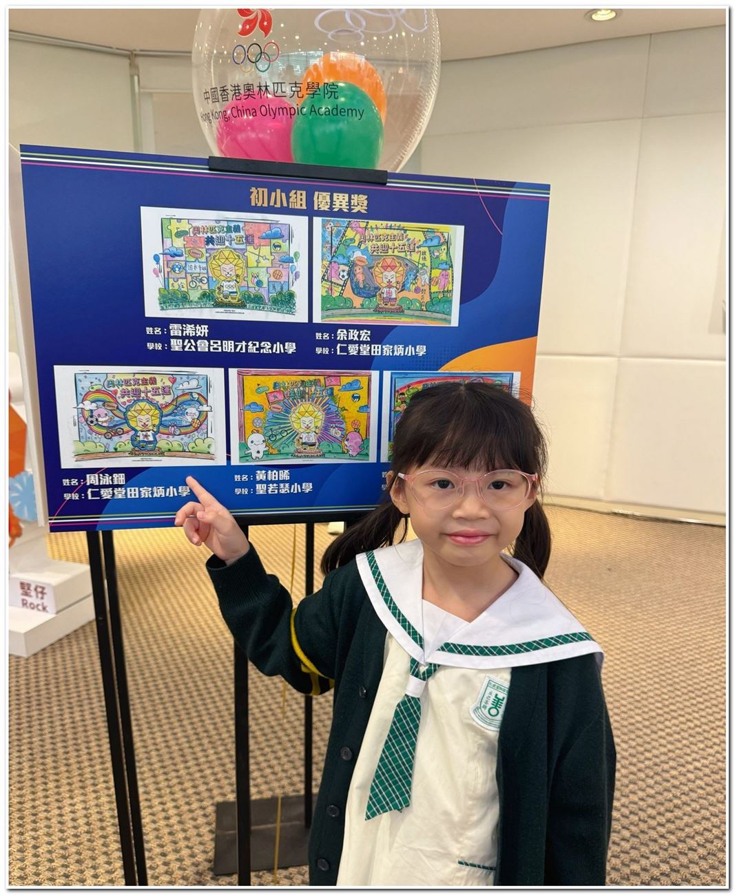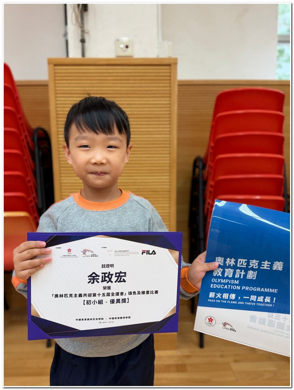 是次比賽由視藝科與體育科聯合邀請全校同學參與「奧林匹克主義共迎第十五屆全運會填色及繪畫比賽」,參與人數眾多。經中國香港體育聯盟評選後,由本校1D班余政宏同學及2E 班周泳鈿同學在眾多參賽者中脫穎而出,榮獲初小組別「優異獎」,在此向兩位同學致以熱烈祝賀!