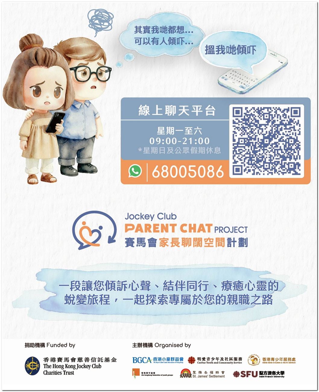 *賽馬會「家長聊闊空間」計劃是一個全方位支援計劃,為家長在育兒路上建立更強大的支援。計劃以培力為核心基礎,為每位家長度身訂造轉化式學習體驗,讓家長以新角度及方向反思親職歷程。透過線上線下多種渠道,為家長提供靈活而方便的支援服務,提升及培養其個人能力及信心,照顧不同處境下的家庭需要。學校將會派發以下咭片,家長可透過線上聊天服務獲得支援及陪伴。