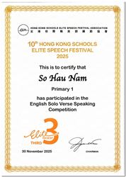 Our students have joined the 10th Hong Kong Schools Elite Speech Festival organized by Hong Kong School Elite Speech Festival Association. The participants have showcased their exceptional linguistic talent and interpretive ability.