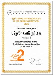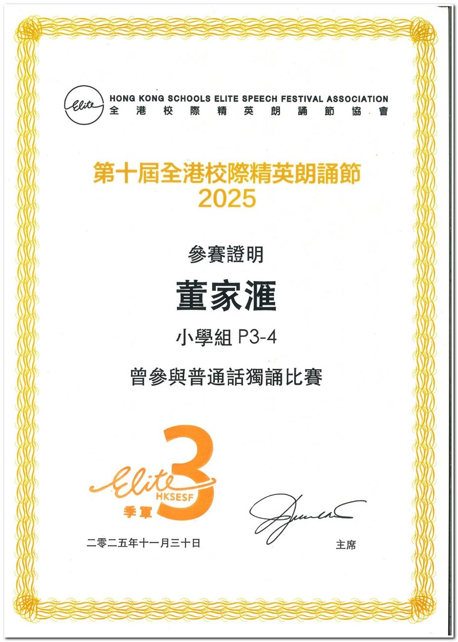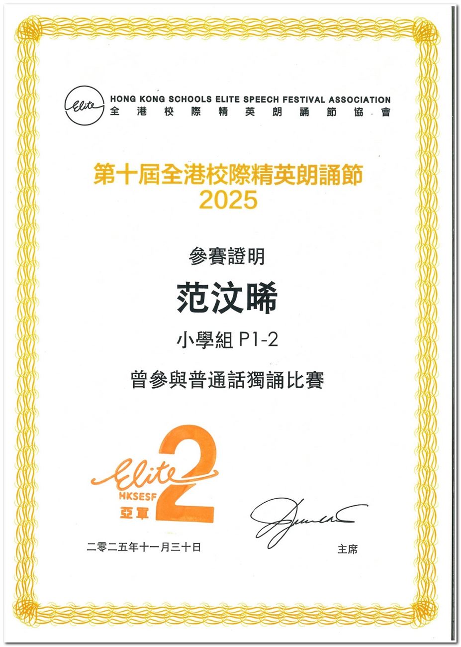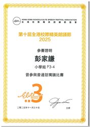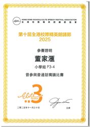 「全港校際精英朗誦節協會」於2017年成立,致力於提供一個積極且具競爭性的平台,培育英語、普通話、粵語朗誦及公開演講的人才。 第十屆全港校際精英朗誦節於二零二五年十一月三十日(星期日)舉行。參賽者各自展現了卓越的語言天賦與演繹能力,充分演繹了所選作品,在表達力、聲音控制及情感投入等方面獲得了高度評價。我校普通話組參賽同學的傑出表現令在場觀眾和評委驚嘆,博得熱烈的掌聲與讚美,成績斐然。