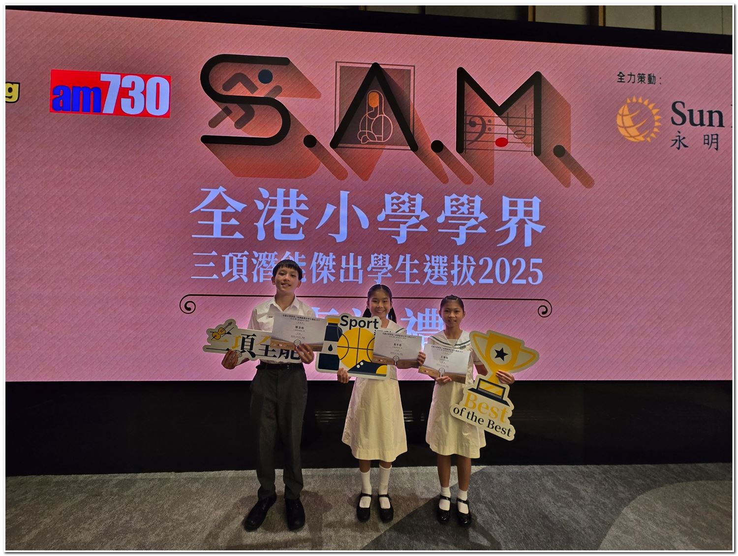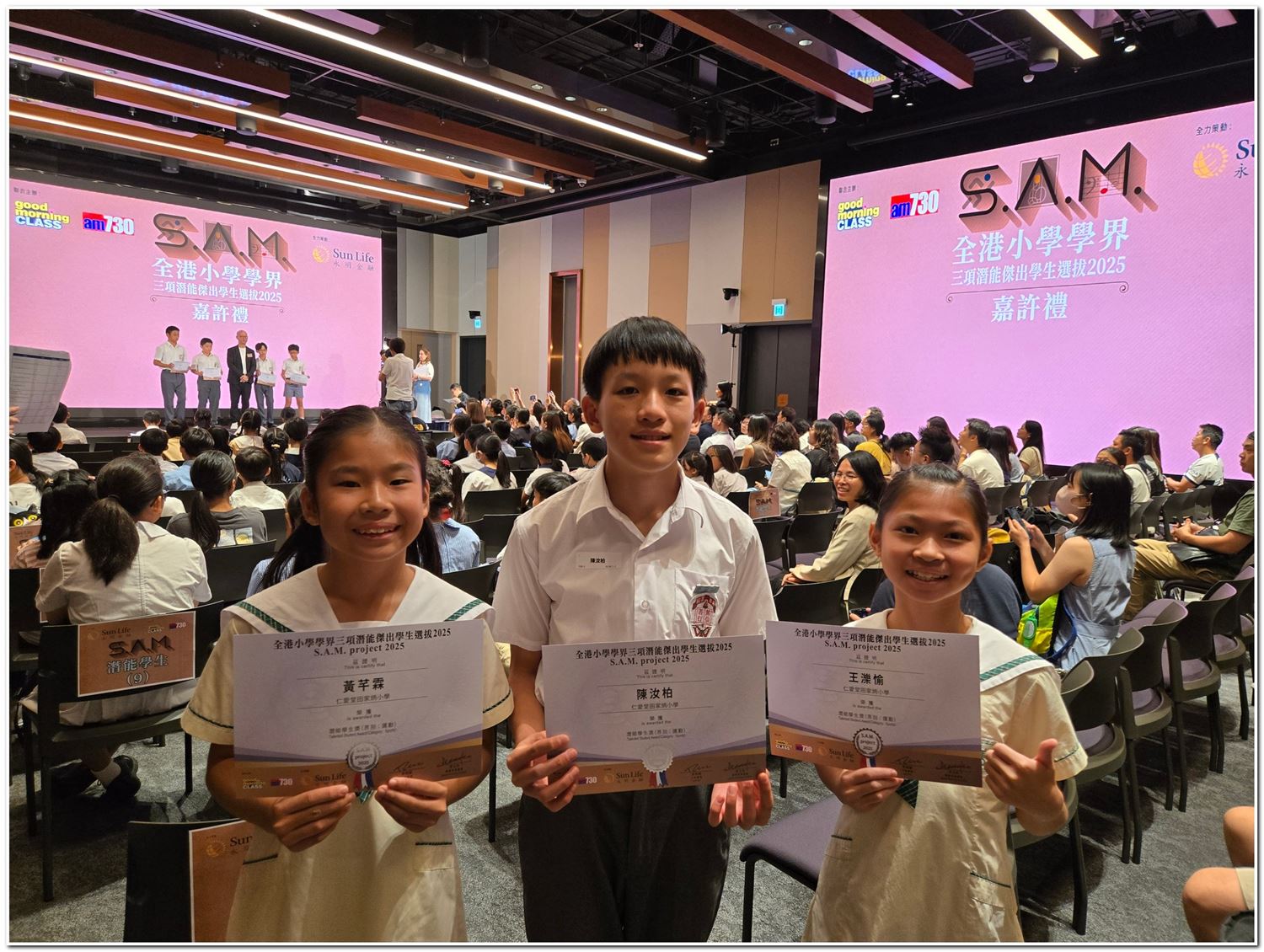 由《am730》及good morning CLASS舉辦的「全港小學學界三項潛能傑出學生選拔2025嘉許禮」於2025年9月28日進行,此計劃旨在表揚有潛能的學生在體育、藝術、音樂等範疇有出色的表現,並獲得肯定和嘉許。每範疇均進行獨立選拔,全港學校按十八區劃分,以同一區域內的學校進行選拔。大會將根據學生所提交之相關項目比賽成績及學校評語進行評核,凡通過有關之評核則獲大會頒發【潛能學生獎】之認證。在眾多對手下,5B王濼愉、5B黃芊霖及畢業生陳汝柏均獲得【潛能學生獎】(體育方面)。